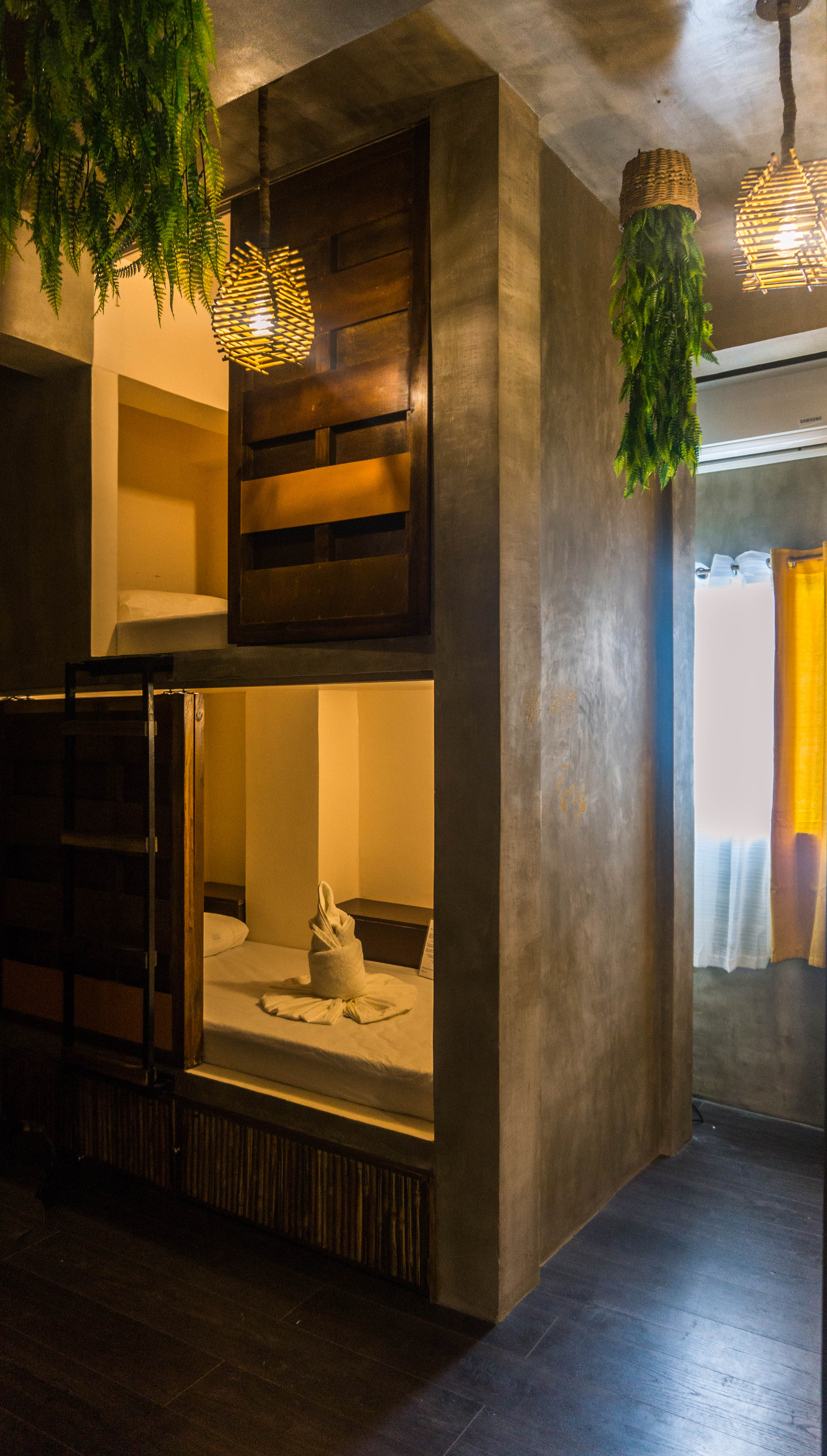 Nestled in the bustling heart of El Nido town, these spacious and inviting 6-bed dormitories offer ideal budget accommodation for solo travelers and groups. Featuring amenities such as air conditioning, wooden shutters, electrical outlets, personal fans, and lockable boxes in each bed, they ensure both comfort and privacy. Additionally, guests can enjoy a shared bathroom equipped with three hot-water showers, three toilets, and a large sink with a mirror for added convenience.